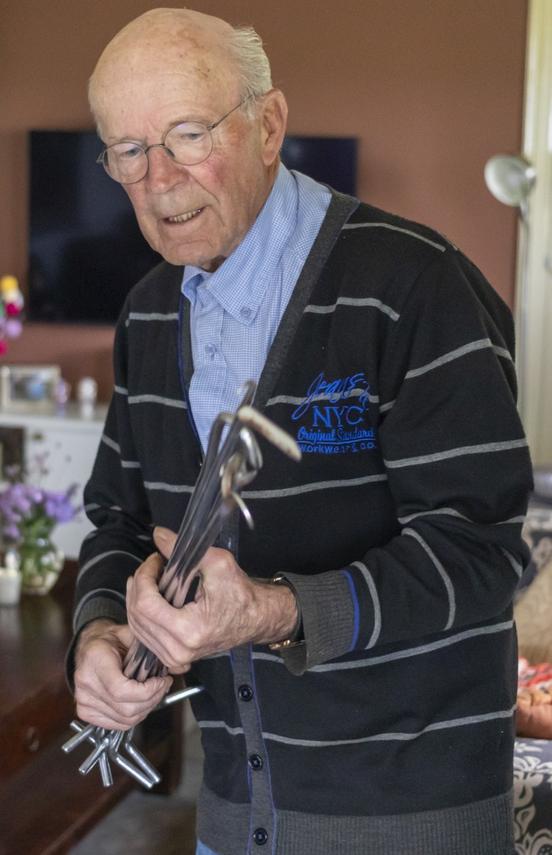 Frans Groothuis opent de leren foudraal met gereedschappen. (foto J. Bunte 2024)
