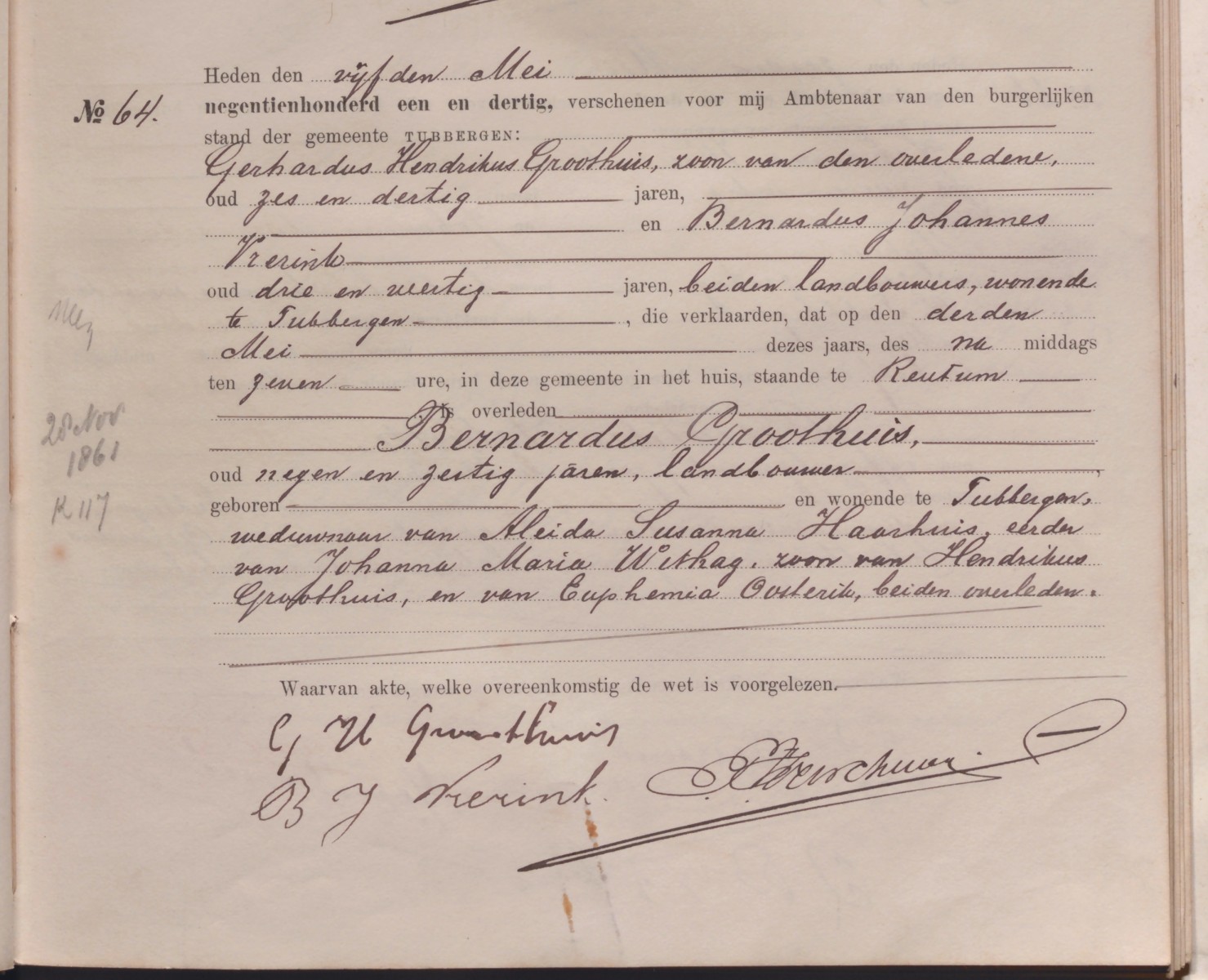 Overlijdensakte Bernardus Groothuis 3 mei 1931 Tubbergen Reutum