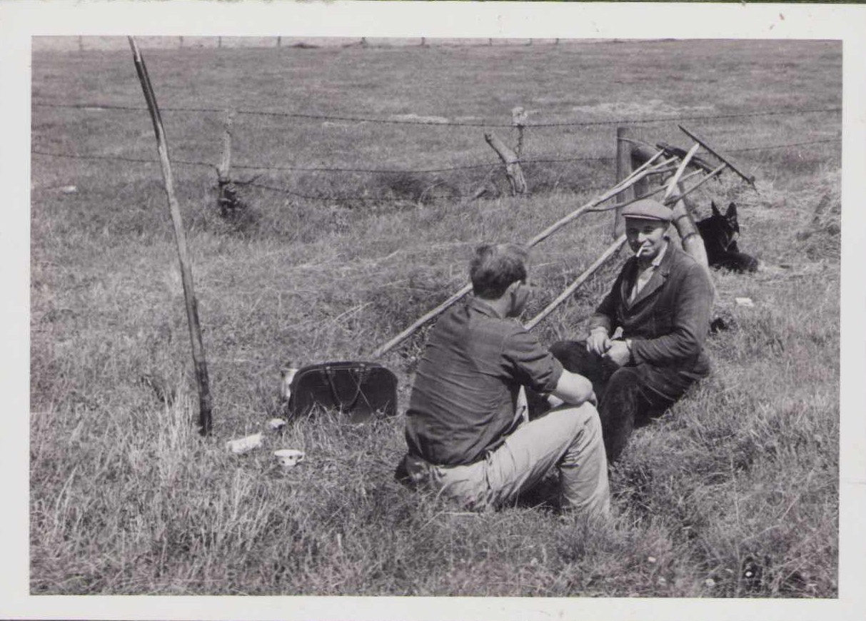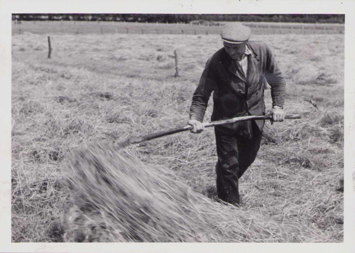 Gerard Groothuis (met pet) in gesprek. Op de achtergrond twee hooi harken.