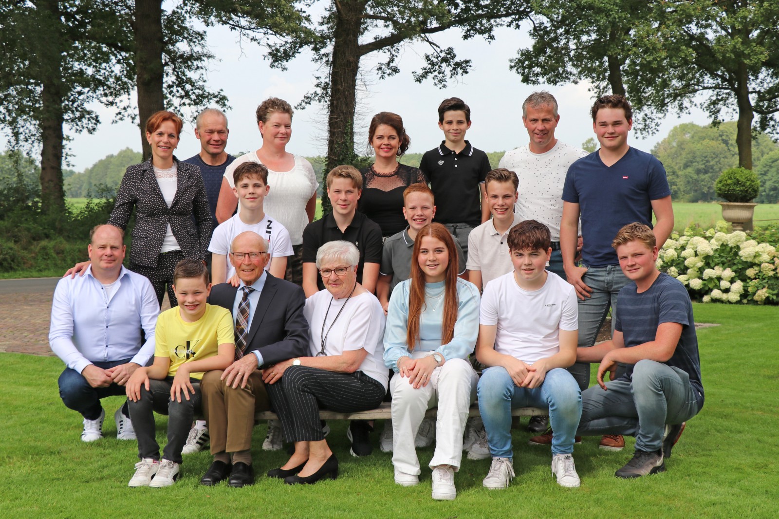 Staand v.l.n.r. Harrie Lammerink (man van Mariet), Henk Groothuis, Gerrit Groothuis, Jan Mulder (man van Anneke), Ada van Jan Groothuis, Benny Groothuis, Anneke Mulder Groothuis, Frans Groothuis, Gerard Lesscher (man van Sanny Groothuis), Marietje van Bennie Groothuis, Jan Groothuis, Lies van Gerrit Groothuis, Gerda Groothuis. Zittend v. l.n.r. Mariet Groothuis, Rosa Groothuis, Moeder Groothuis-Hermelink, Vader Gerard Groothuis, Sanny Lesscher Groothuis, met Carolien en René (kinderen van Gerrit en Lies), Lyda Droste Groothuis, Harry Droste.
