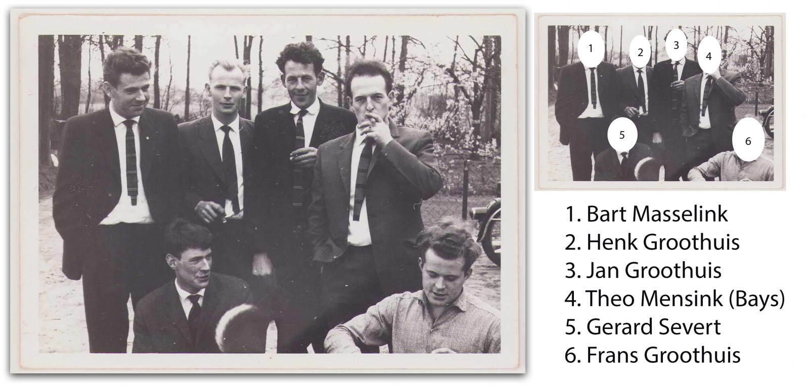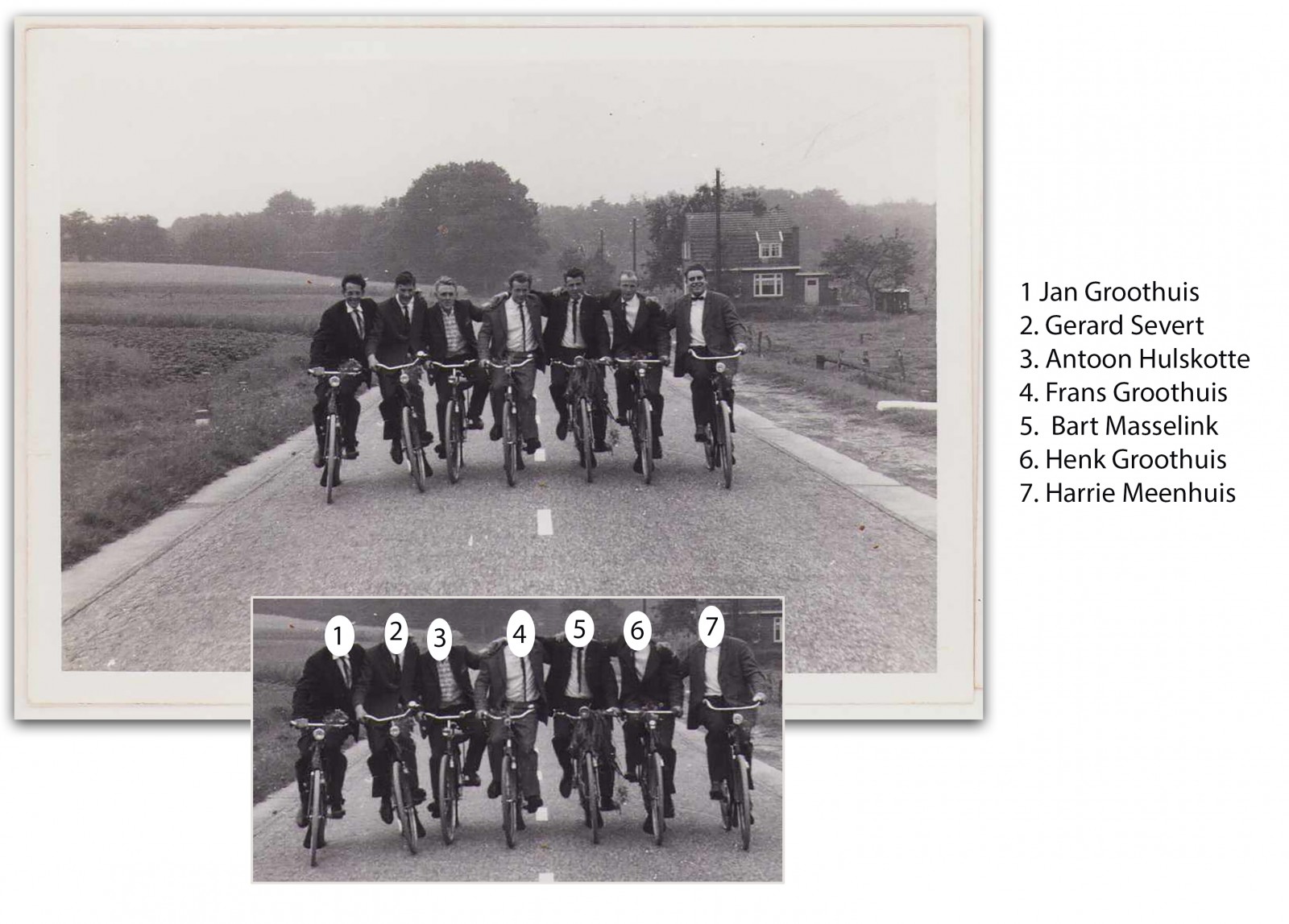 Frans verteld over zijn vriendengroep die ontstaan is toen ze allemaal rond de 19, 20 jaar oud waren. Een vriendengroep die een leven lang mee is gegaan, totdat de coronatijd aanbrak. Frans: ”Meenhoes Willem, Theo Bays, Jan Groothuis, Bart Masselink van Sniedersboer, Antoon Hulskotte, Beukers Johan, Deperink, Vinken Gerrit, Henk Groothuis, Frans Groothuis, Harrie Lammerink maakten allemaal deel uit van de groep. Sommigen zijn later aangesloten”.