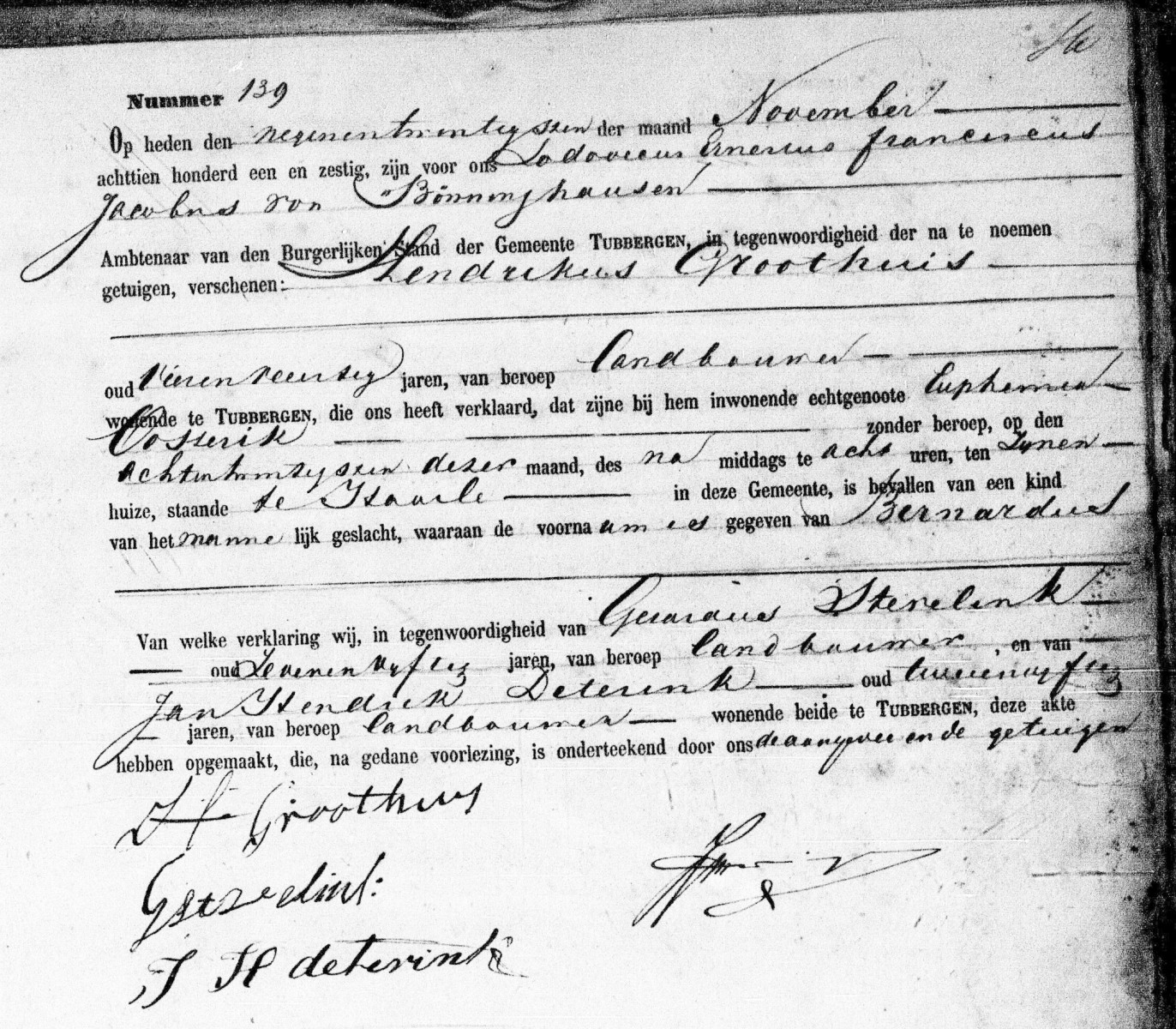 Geb. akte Bernardus Groothuis 28 november 1861 Tubbergen Haarle