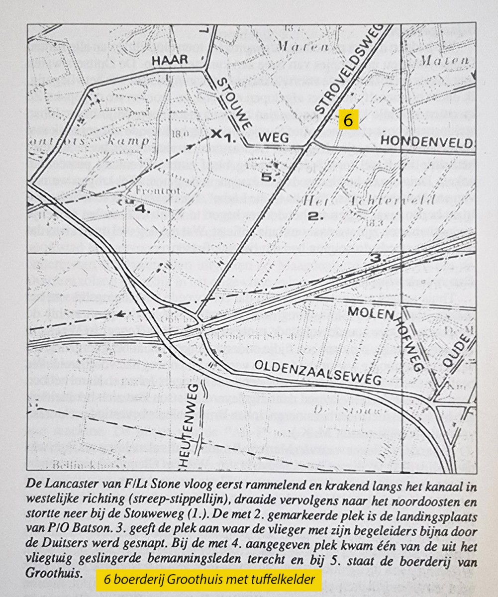 “De tuffelkelder had een klein deurtje; daar keken we door naar de lucht. We lagen allemaal op een rij, vader vooraan, het deurtje deels geopend, over zijn schouder keken wij mee. In de pinksternacht van 12 op 13 juni 1943 was er een hevig lawaai in de lucht. Een Britse Lancaster bommenwerper had problemen. Hij kwam steeds lager en lager. De brandende bommenwerper werd bemand door Canadezen. Hij vloog tot bij de beek bij Stouw. Nog geen kilometer van waar wij in de kelder lagen, stortte het vliegtuig neer. De volgende ochtend gingen de broers van mij kijken op de rampplek. Ik was de kleinste van de jongens en liep er stiekem al vallend en strompelend achteraan. Voorop liepen Bennie, Gerrit, Jan, ons Henk en dan kwam ik. Mijn broers waren allemaal ouder en konden veel harder lopen dan ik. Bij het toestel stonden de Duitsers met geweren, dat maakte je angstig. Die tijd vergeet je nooit weer. Ik heb de piloten zien liggen in de wei. Een van de piloten hing boven in de boom. Sommige beelden raak ik nooit meer kwijt. Ik kan nu nog precies aanwijzen waar de piloot op de grond lag of beter gezegd in de grond, het was gewoon een kuil waar hij in lag. De overleden piloten liggen begraven op het kerkhof van Reutum. Allemaal jongens van begin twintig. Een stuk of drie piloten hebben zich weten te redden met parachutes. Ze hebben zich kunnen verbergen voor de Duitsers”.