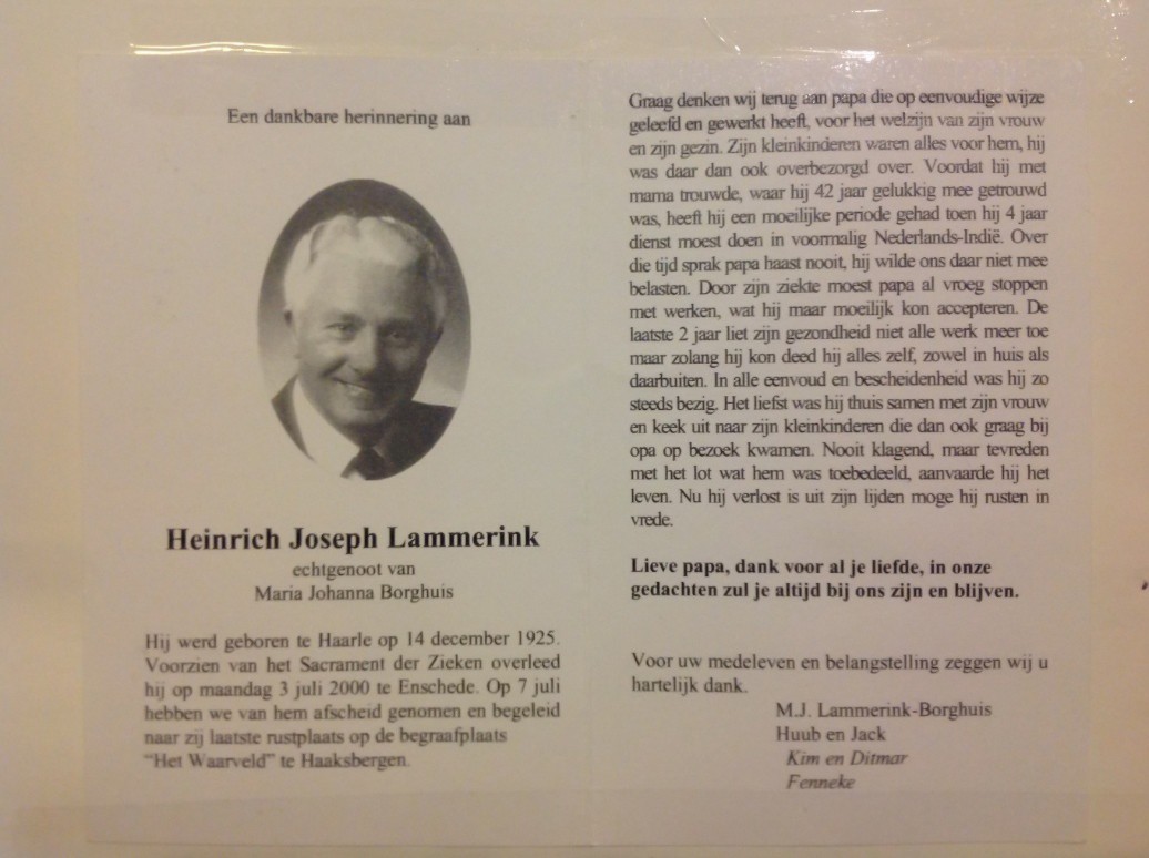 Harrie Lammerink is overleden 3 juli 2000 op 74 jarige leeftijd, 4 maand na zijn zus Zuster Charitas. Harrie is begraven op het kerkhof te Haaksbergen.