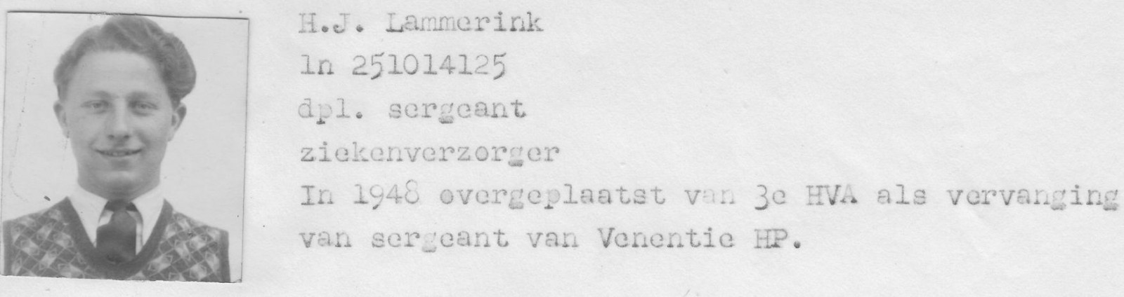 Harrie moet zich 8 mei 1946 (20 jaar oud) melden te kamp Holterhoek nabij Eibergen om te starten met de opleiding van soldaat. Na 6 weken wordt hij eind juni te Nijmegen geplaatst, in het hospitaal van NEBO-klooster om als verpleger te worden opgeleid. Vervolgens is dan op 28 oktober 1946 de tocht met de Johan de Wit boot, om te worden uitgezonden naar het verre Oost-Indië.