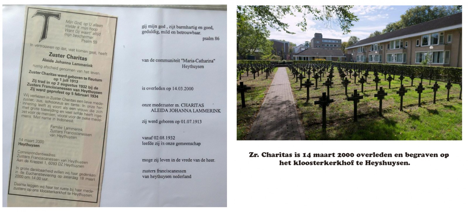 Op 2 augustus 1932 is ze ingetreden bij de zusters Franciscanessen te Heythuysen in Limburg. Ze werd door haar moeder Maria, en de zussen An en Marie naar het station te Almelo gebracht, met bakker ter Beek als chauffeur. Hij was de enige in Reutum en Haarle die een auto had. Rond maart 1934 kwam ze vrij onverwacht thuis om te vertellen dat ze naar de missie werd uitgezonden. Ze had de naam gekregen van Zuster Charitas. Ze zou naar Nederlands-Indië gaan, naar een ziekenhuis van de zusters Franciscanessen. In het St.-Elisabeth Ziekenhuis te Semarang op het eiland Java werkte ze eerst in de keuken totdat de oorlog uitbrak in 1939 – 1940 in Europa en Oost-Indië. In Europa had Duitsland eerst Polen ingenomen en vervolgens Nederland, België en Frankrijk. In Oost-Indië was het Japan die oorlog ging voeren. Ze heeft 2 jaar in een Japans interneringskamp gezeten, tot aan de bevrijding in 1945. Ze ging direct weer naar het ziekenhuis St.-Elisabeth om het weer op te bouwen.